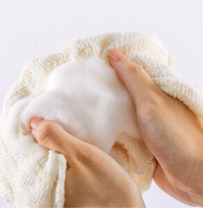 国内にはほとんど残っていない野菜ネット用の古い丸編み機を用いて、手作業で調整しながら加工する技術は、まさしくオンリーワン。目の粗い二重構造が空気をたっぷり含んで泡立ち、肌あたりは非常に柔らかい。